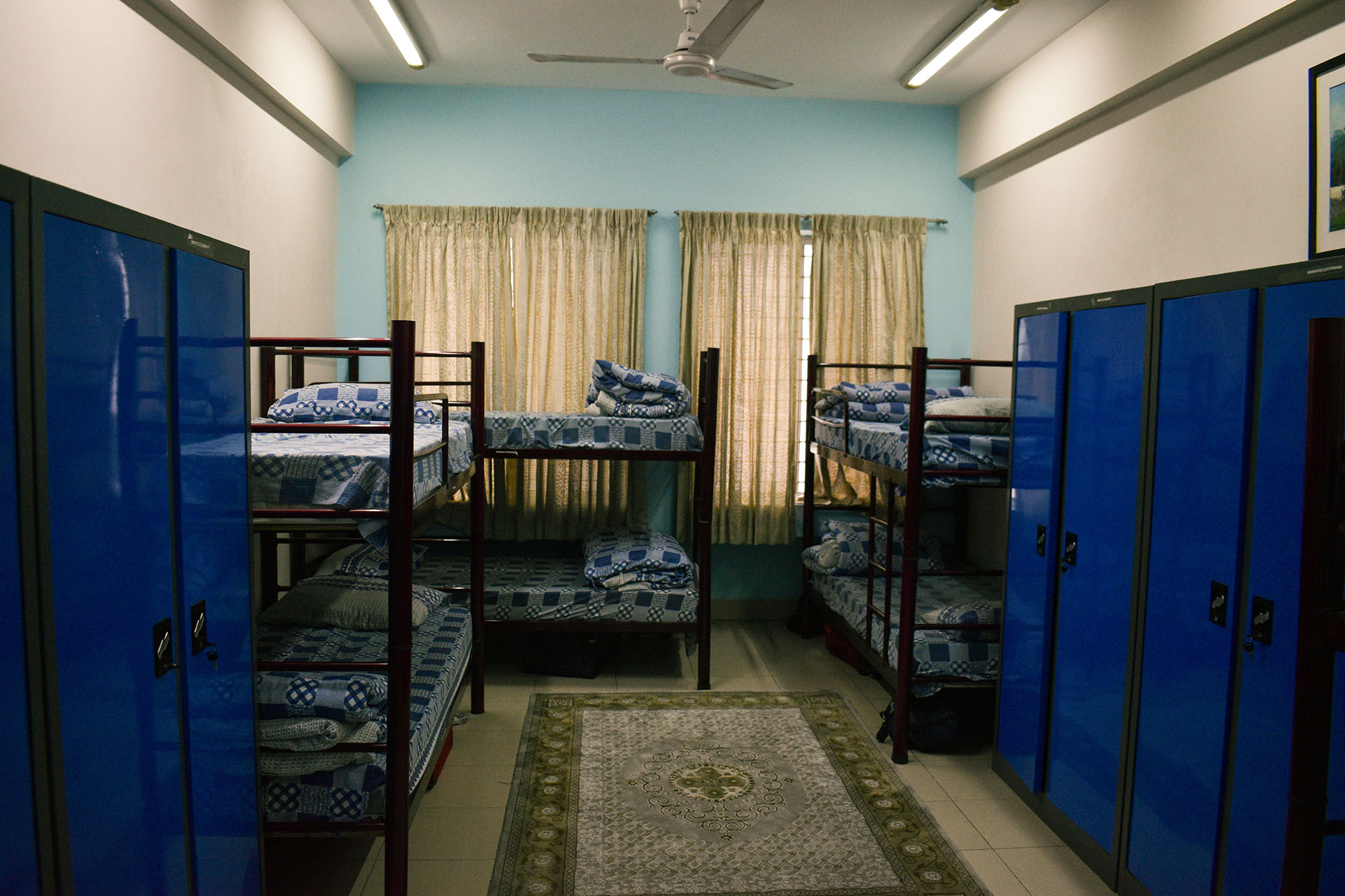 Each room is furnished with bunk beds, accommodating 6-8 students, along with personal lockers for secure storage. The setup ensures a comfortable and organized living space for all dormitory residents.